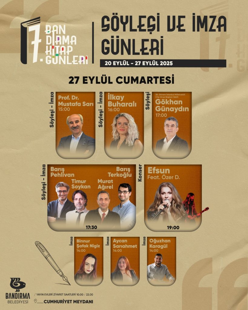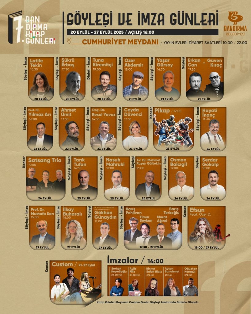 Kelimelerin denizinde yine birlikte yol alıyor, sayfaların rüzgarıyla yeni limanlara yelken açıyoruz. 7. Bandırma Kitap Günleri için geri sayım başladı. 20-27 Eylül tarihleri arasında Cumhuriyet Meydanı’nda gerçekleşecek olan Kitap Günlerinde binlerce kitap, seçkin yazarlar, konuklar, onlarca yayınevi, söyleşiler, dinletiler ve imza programlarıyla dopdolu bir program yine sizleri bekliyor.