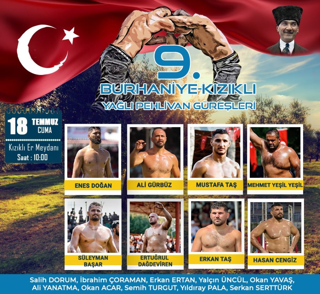 Burhaniye Belediye Başkanı Ali Kemal Deveciler’in ev sahipliğinde düzenlenecek güreşlerde, Türkiye’nin önde gelen baş ve başaltı yağlı güreş pehlivanlarının yanı sıra, birçok farklı boyda pehlivanlar da er meydanına çıkacak. Bu yılki güreşlerde; Enes Doğan, Ali Gürbüz, Mustafa Taş, Mehmet Yeşil Yeşil, Süleyman Başar, Ertuğrul Dağdeviren, Erkan Taş ve Hasan Cengiz gibi tanınmış başpehlivanlar mücadele edecek.
