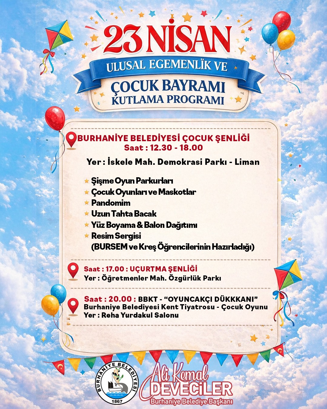 Burhaniye Belediyesi tarafından çocukların Ata’larından armağan olan bayramlarını doyasıya kutlamaları için hazırlıklarda sona gelindi. 23 Nisan günü sabahtan akşama dek Burhaniye’de Ulusal Egemenlik ve Çocuk Bayramı kutlamaları sürecek. Burhaniye 8 Eylül Stadı’nda resmi tören ile başlayacak bayram, saat: 12.30 ve 18.00 saatleri arasında İskele Mahallesi Demokrasi Parkı’nda kurulacak şenlik alanında devam edecek. Şişme oyun parkurları, çocuk oyunları ve maskot, pandomim, uzun tahta bacak, yüz boyama, resim sergisi, balon dağıtımı ile çocuklar eğlenceye doyacak. Saat: 17.00’de  Öğretmenler Mahallesi Özgürlük Parkı’nda gökyüzünün rengarenk uçurtmalarla buluşacağı uçurtma şenliğinden sonra ise saat: 20.00’de Reha Yurdakul Kültür Merkezi’nde Burhaniye Belediyesi Kent Tiyatrosu’nun yeni çocuk oyunu, “Oyuncakçı Dükkanı” sahnelenecek.