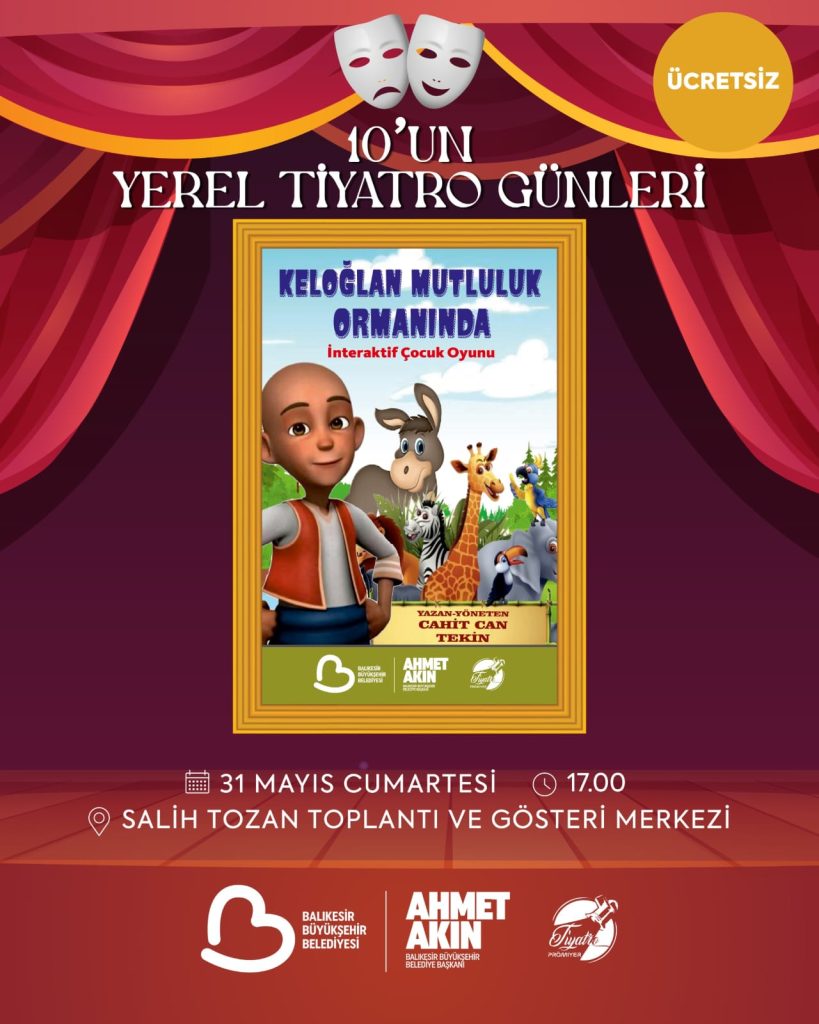 İl genelinde faaliyet gösteren yerel tiyatro topluluklarını desteklemek amacıyla “10’un Yerel Tiyatro Günleri” programını başlatan Balıkesir Büyükşehir Belediyesi, yetişkin ve çocuk oyunlarını seyircilerle buluşturacak. 31 Mayıs- 1 Haziran ve 2 Haziran tarihlerinde üç yetişkin, iki de çocuk oyununun gösterimi yapılacak. Bu kapsamda 31 Mayıs Cumartesi günü saat 17.00’de Salih Tozan Toplantı ve Gösteri Merkezi’nde “Keloğlan Mutluluk Ormanında” adlı interaktif Çocuk Oyunu ve saat 20.00’de Mor Cepken Kadın Tiyatrosunun “Otobüs” isimli yetişkin oyunu sahnelenecek. Salih Tozan Toplantı ve Gösteri Merkezi’nde 1 Haziran Pazar günü saat 15.00’te “Arı Kardeş” çocuk oyunu ve saat 20.00’de “Türk Kadını Efsanesi” isimli yetişkin oyunu izleyicilerle buluşacak. 2 Haziran Pazartesi günü ise “La Nonna” isimli yetişkin tiyatro oyunu Avlu Kongre ve Kültür Merkezi’nde perdelerini açacak.