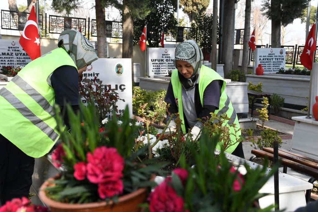 Şehitliklerde düzenli olarak yapılan temizlik ve bakım çalışmaları kapsamında şehit mezarlarının bakımları tamamlandı. Yıpranan Türk bayrakları yenileriyle değiştirilirken il genelindeki şehit mezarları 15 bin karanfille donatıldı. Vatandaşların kabir ziyaretlerini rahatlıkla yapabilmeleri için şehitliklerde detaylı bir bakım ve temizlik gerçekleştiren Balıkesir Büyükşehir Belediyesi, vatan toprakları için canını hiç düşünmeden veren aziz şehitlerine büyük bir vefa örneği gösterdi.