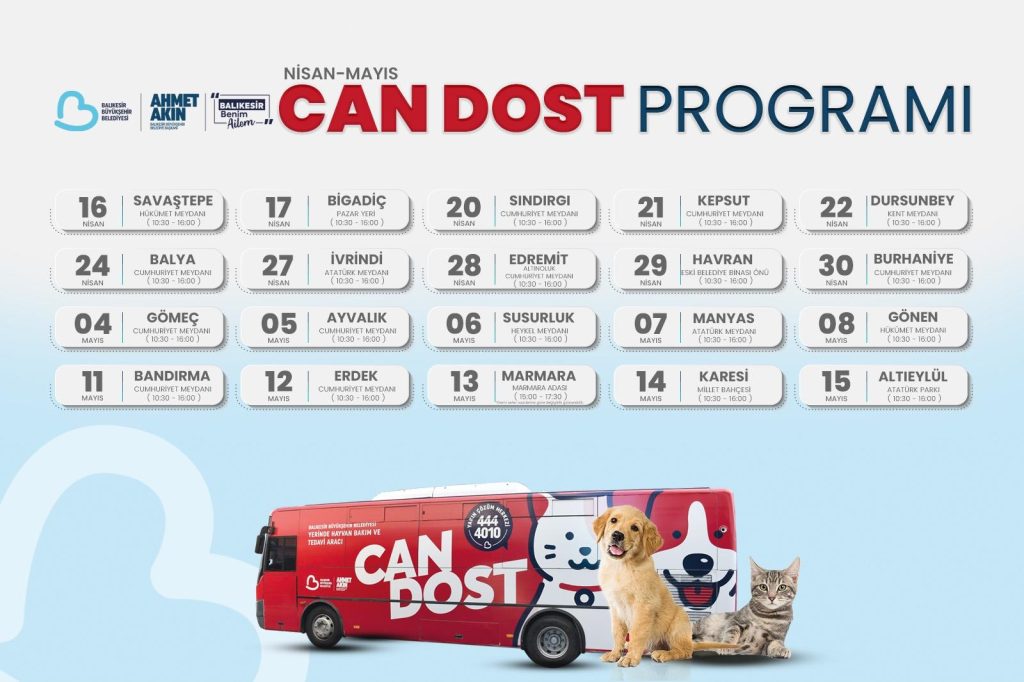Sokaktaki canlara tedavi ve bakım hizmeti sağlayan Can Dost Yerinde Hayvan Bakım ve Tedavi Aracı’nda, uzman veteriner hekimler tarafından sokaktaki canların parazit uygulaması, kuduz aşısı ve rutin kontrolleri yapılıyor. Sokakta zorlu şartlar altında yaşamını sürdüren patili dostlara şifa olan Can Dost Yerinde Hayvan Bakım ve Tedavi aracı 16 Nisan’da Savaştepe-Hükümet Meydanı’nda programına başlayacak. Ardından 17 Nisan Bigadiç-Pazar Yeri, 20 Nisan Sındırgı-Cumhuriyet Meydanı, 21 Nisan Kepsut-Cumhuriyet Meydanı, 22 Nisan Dursunbey-Kent Meydanı, 24 Nisan Balya-Cumhuriyet Meydanı, 27 Nisan İvrindi-Atatürk Meydanı, 28 Nisan Edremit-Altınoluk Cumhuriyet Meydanı, 29 Nisan Havran-Eski Belediye Binası Önü, 30 Nisan Burhaniye-Cumhuriyet Meydanı’nda devam edecek. 4 Mayıs’ta Gömeç- Cumhuriyet Meydanı, 5 Mayıs Ayvalık- Cumhuriyet Meydanı, 6 Mayıs Susurluk-Heykel Meydanı, 7 Mayıs Manyas-Atatürk Meydanı, 8 Mayıs Gönen-Hükümet Meydanı, 11 Mayıs Bandırma-Cumhuriyet Meydanı, 12 Mayıs Erdek-Cumhuriyet Meydanı, 13 Mayıs Marmara-Marmara Adası, 14 Mayıs Karesi-Millet Bahçesi’nde devam ettikten sonra 15 Mayıs’ta Altıeylül-Atatürk Parkı’nda sona erecek.